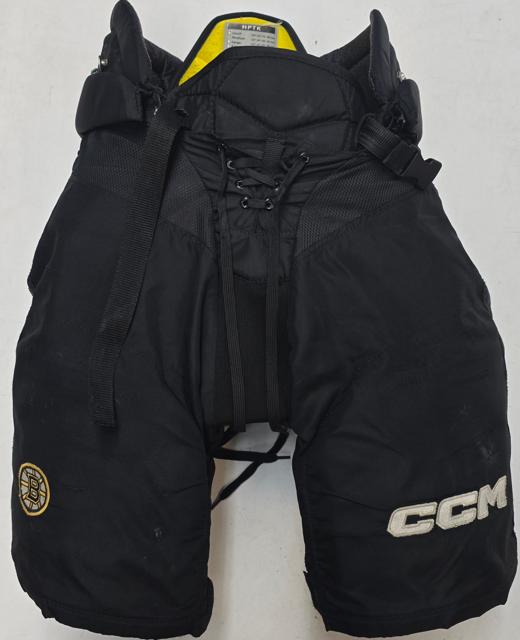 Specs: 1 piece pant, zippered waist allows for +1" adjustment, zippered legs, Adjustable tail bone padding, Bruins logo on front leg, NHL logo on back leg.