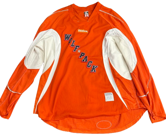 Specs- Orange/white color, Wolfpack diagonal on chest, Reebok logo on front and back, AHL logo on back tail of jersey.